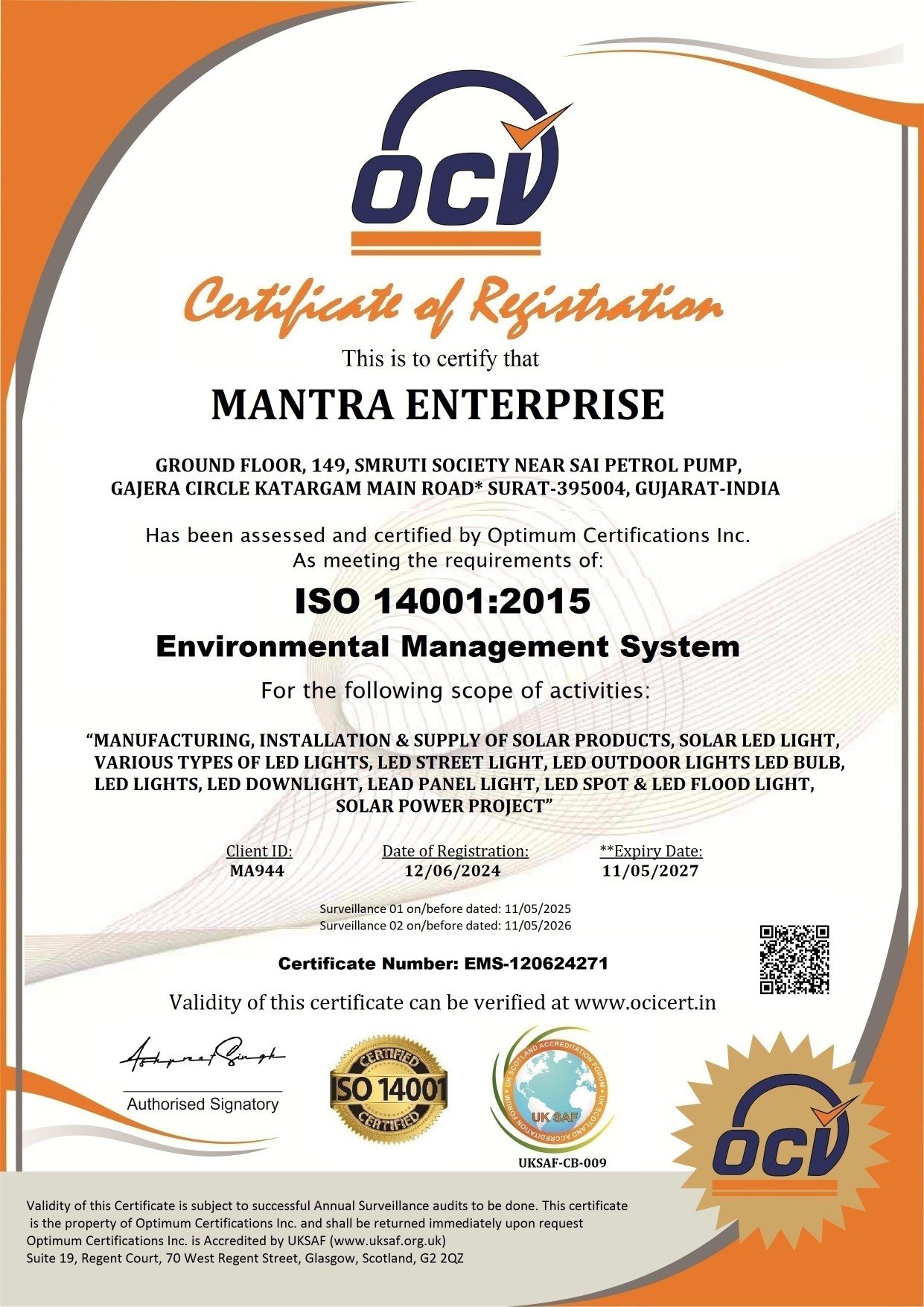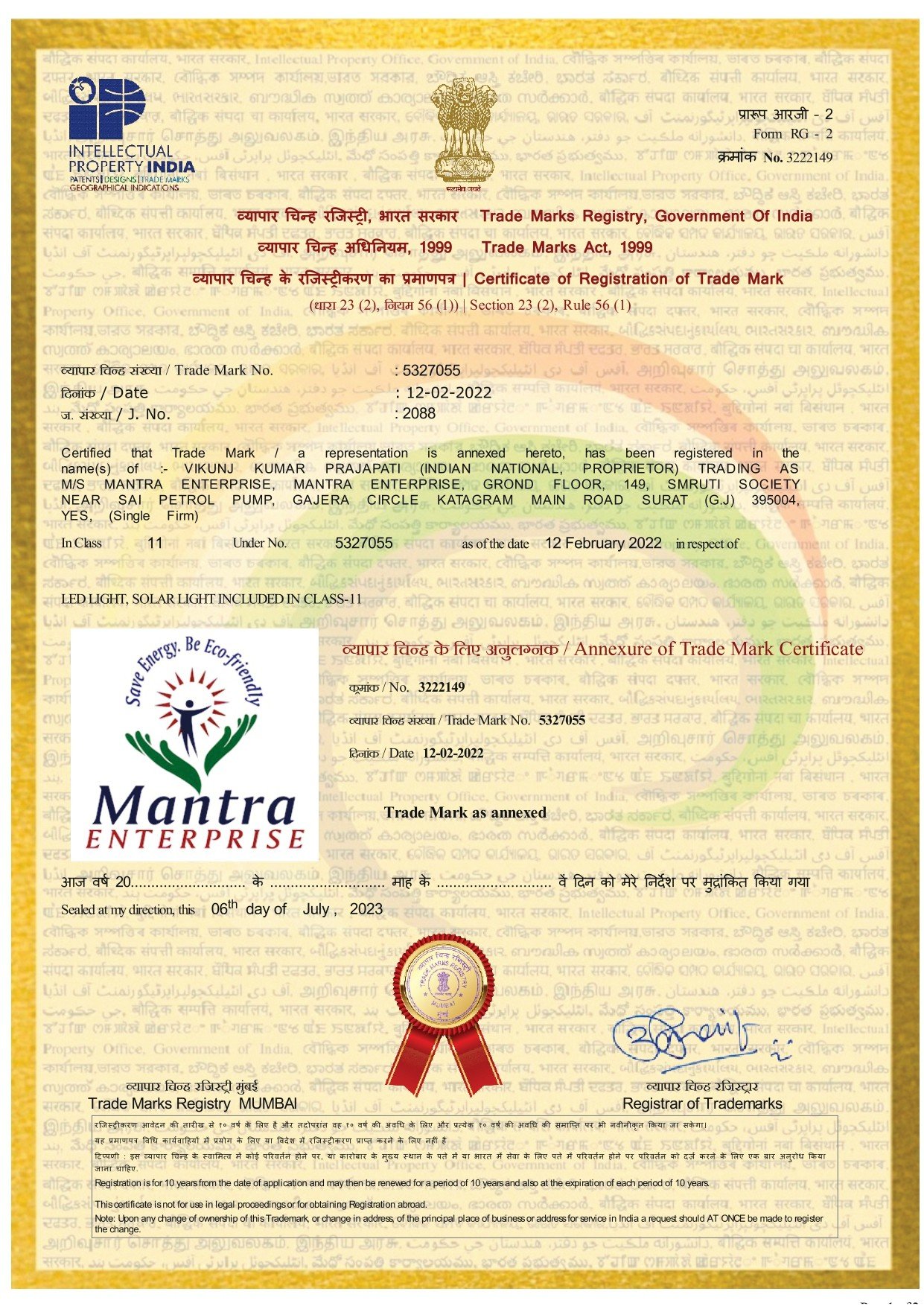 Introducing Mantra Enterprise, a leading manufacturer of solar products based in Surat, Gujarat, India. With our establishment in 2011, we have been dedicated to producing an extensive range of high-quality solar products including solar LED lights, solar home UPS, solar water pumps, solar home lighting systems, LED bulbs, LED lights, LED downlights, LED panel lights, LED spotlights, LED floodlights, and more. Our products are widely recognized in the market for their easy installation, low maintenance, and exceptional durability. Thanks to the visionary leadership of our CEO, Vikunj Prajapati, we have successfully met the diverse needs of our valued clients.